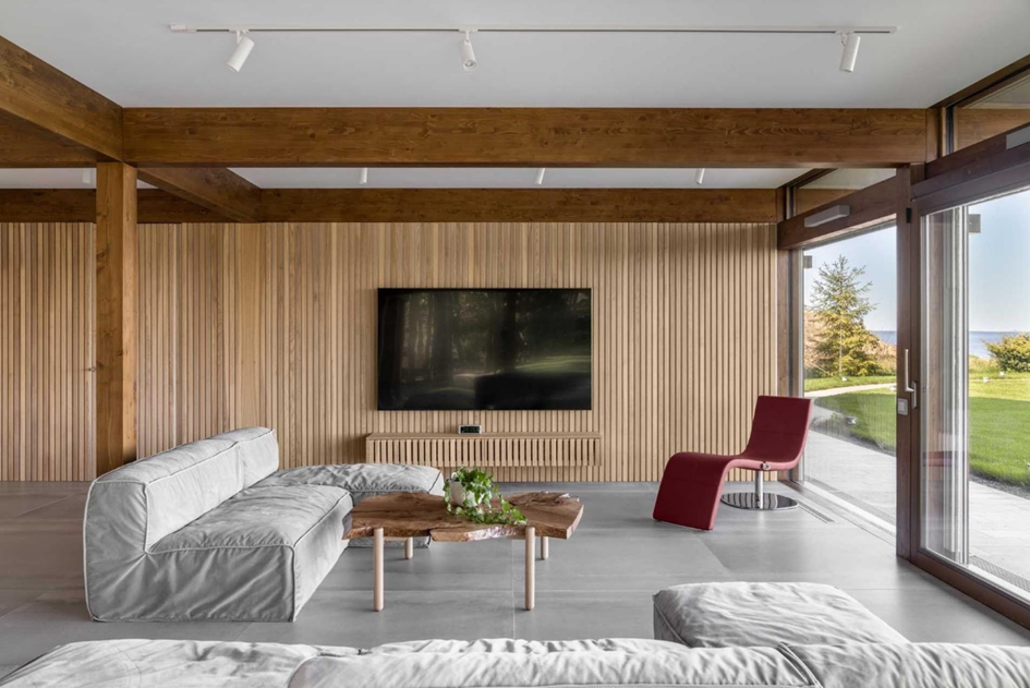 The view of the region can be watched completely from the living room located on the ground floor. The wooden details on the walls are; brought television to the fore. The coffee table, which is also made of wood; helped to integrate the furniture and architectural details.