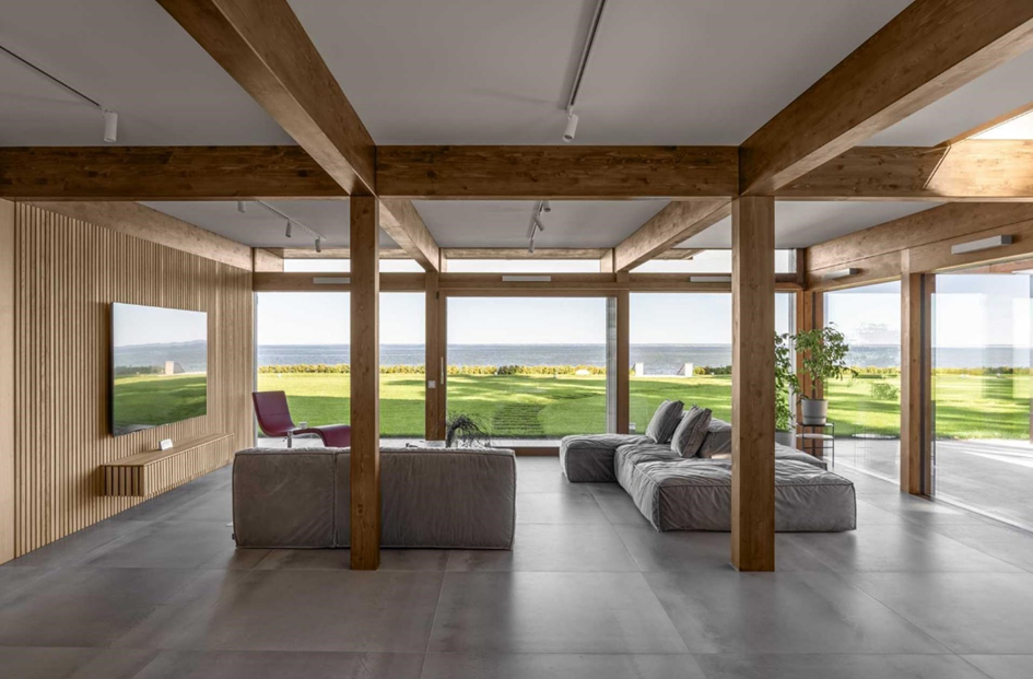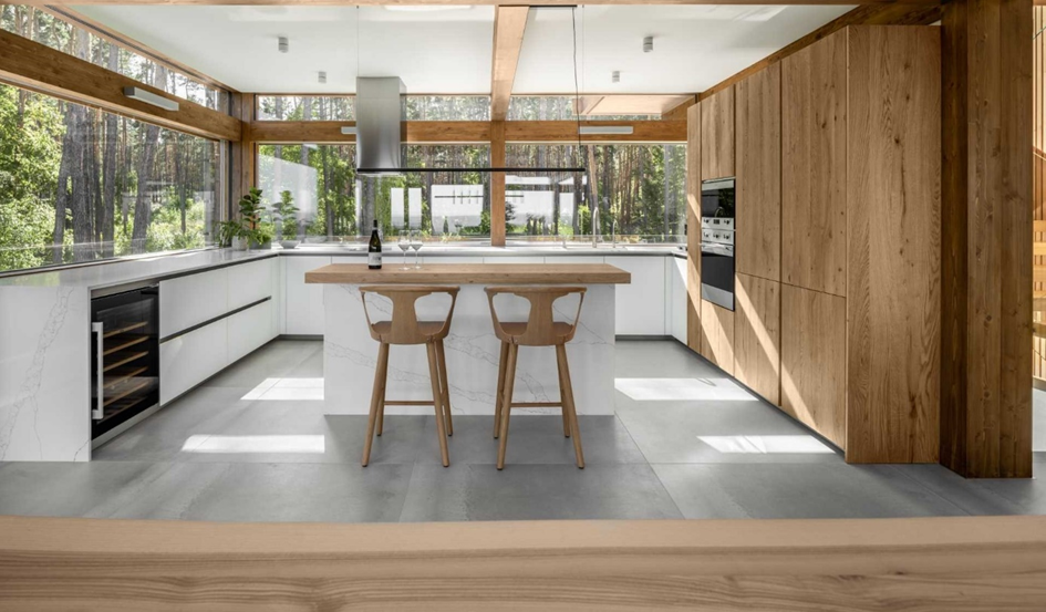 Designed in a minimalist way, the kitchen displays the perfect harmony of white and wood. Cabinets that go all the way to the ceiling provide plenty of room for items. The environment is naturally illuminated with windows covering the counter from one end to the other. Also in this way the magnificent view is invited into the house.